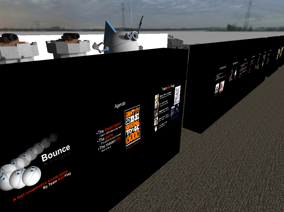 The game concept we came up with was Bounce, a pinball inspired arcade game where each player controlled a robot ball (Mr. Cronk) in a cartoonish environment. The game world contained many elements from pinball, such as bumpers, rails and flippers. The core game mechanics would be bouncing around and exploring this game world.