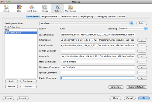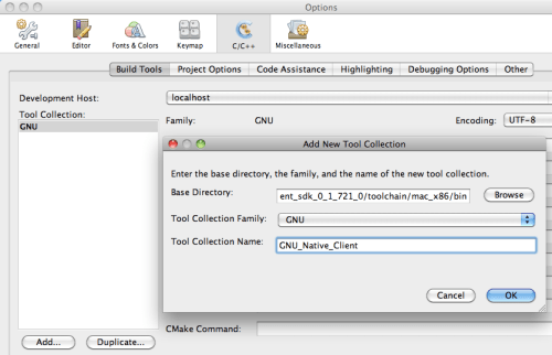 To setup the toolchain open the preferences and select C/C++ -> Build tools click ‘Add…’. In the ‘Add New Tool Collection’ dialog set the Base Directory to ‘(installdir)/toolchain/mac_x86/bin’, set tool collection family to GNU and name it GNU_Native_Client:
