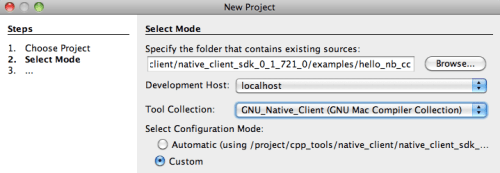Choose C/C++ -> C/C++ Project with Existing Sources. In the next dialog select the directory examples/hello_nb_cc, set the Tool Collection to GLU_Native_Client and choose automatic or custom configuration.
