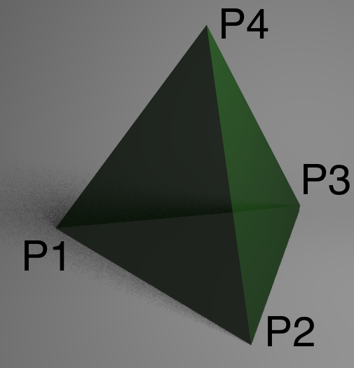 Enough theory, let’s take an example. Let’s see how a tetrahedron can be UV mapped. Basically what we are looking for is a way to go from 3D coordinates (the local mesh-coordinates: x,y,z) to 2D coordinates (u,v).